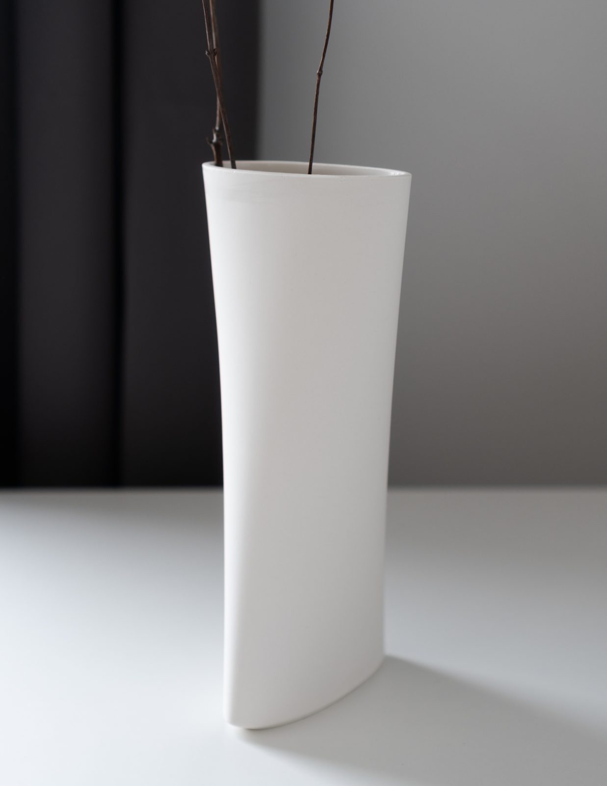 The shape makes use of the way a 3D printer builds shapes – layer for layer. In every layer, the ellipse in the vase is slightly angled, creating a continuous asymmetrical form. Contrast is made by hand as very limited edition.